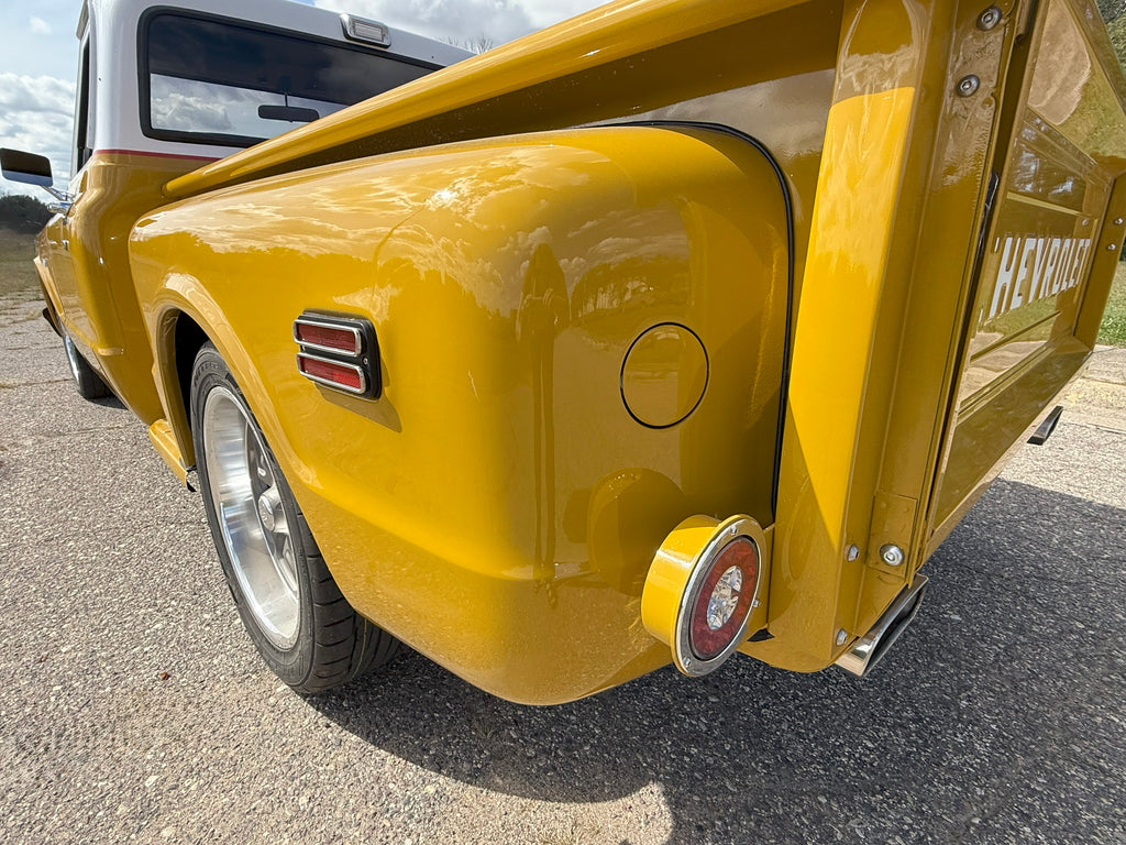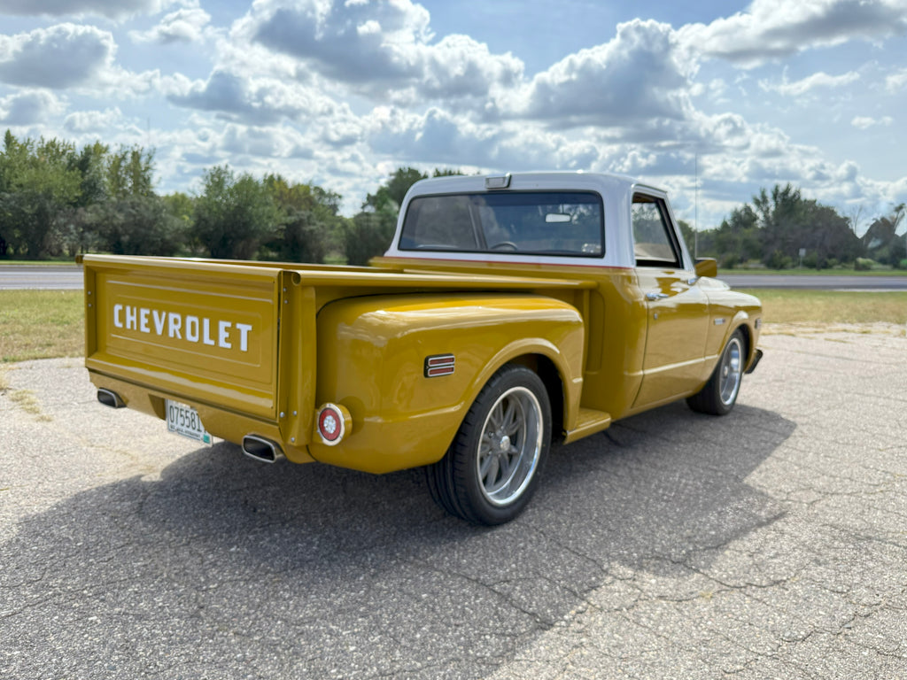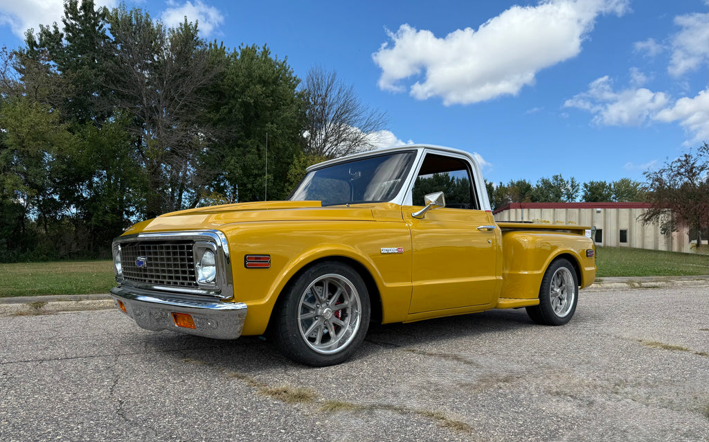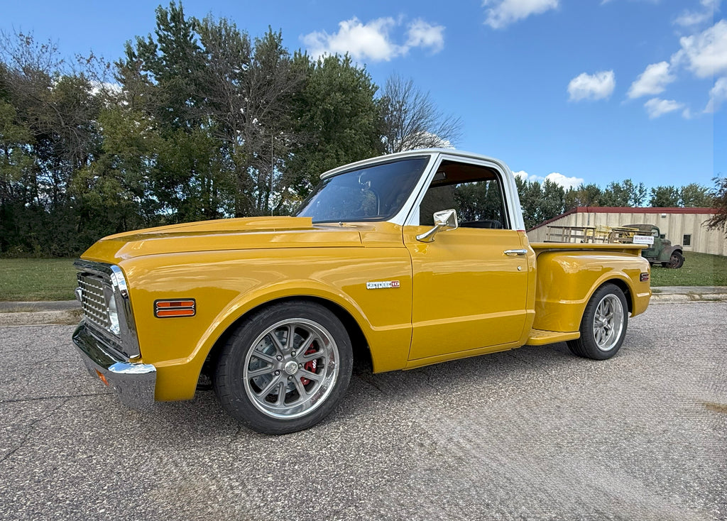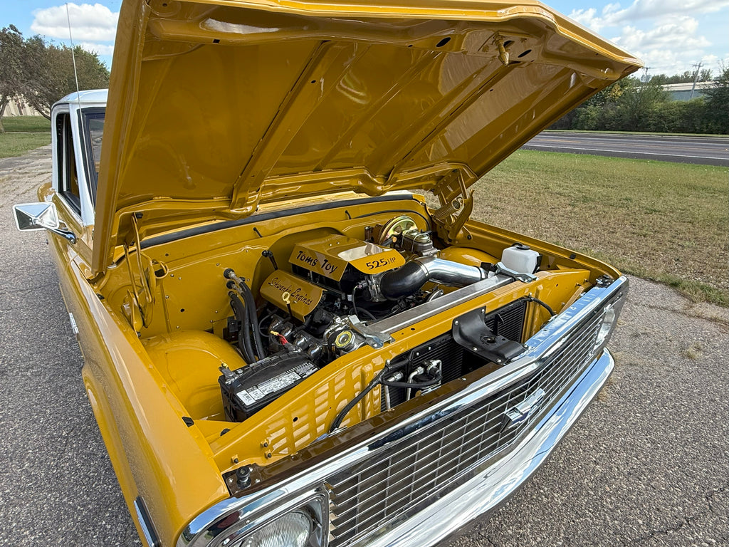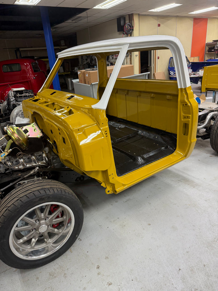 The truck is built with all new cab, box, and body metal, finished in a clean atlas yellow and pearl white two-tone. Subtle details like the stance, wheels, and overall fitment highlight the restomod nature without losing the original C10 character.