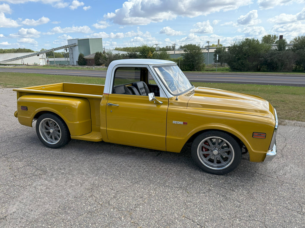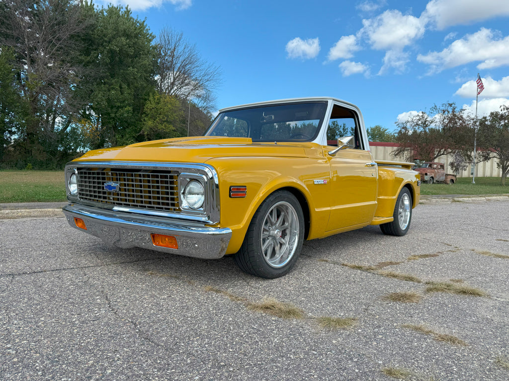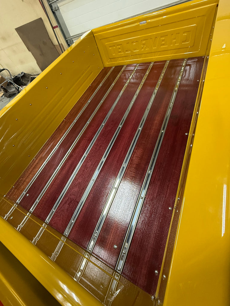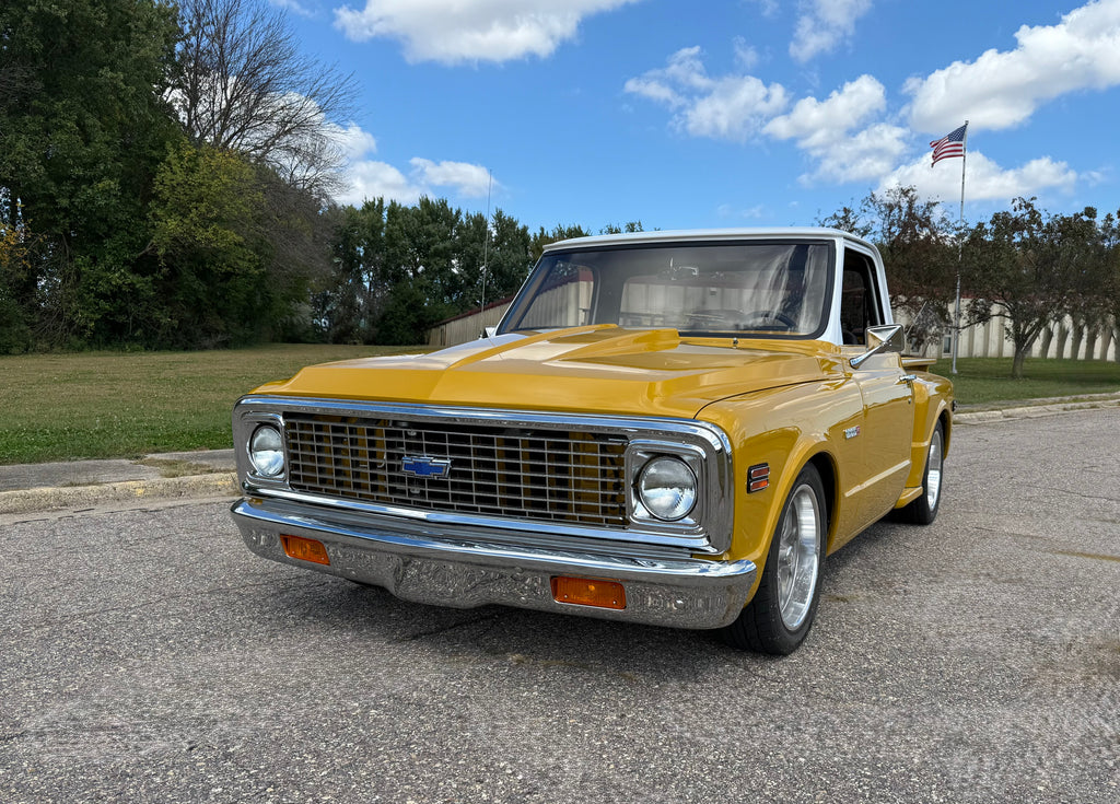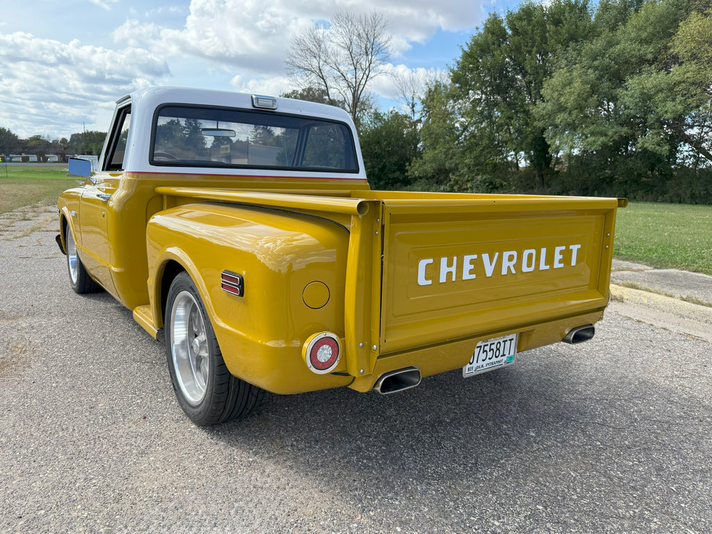The truck is built with all new cab, box, and body metal, finished in a clean atlas yellow and pearl white two-tone. Subtle details like the stance, wheels, and overall fitment highlight the restomod nature without losing the original C10 character.