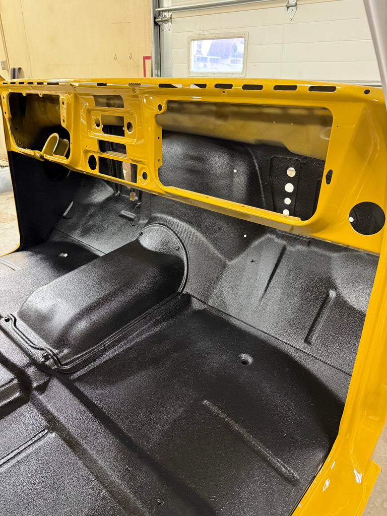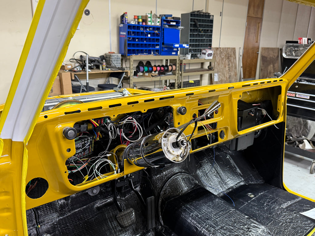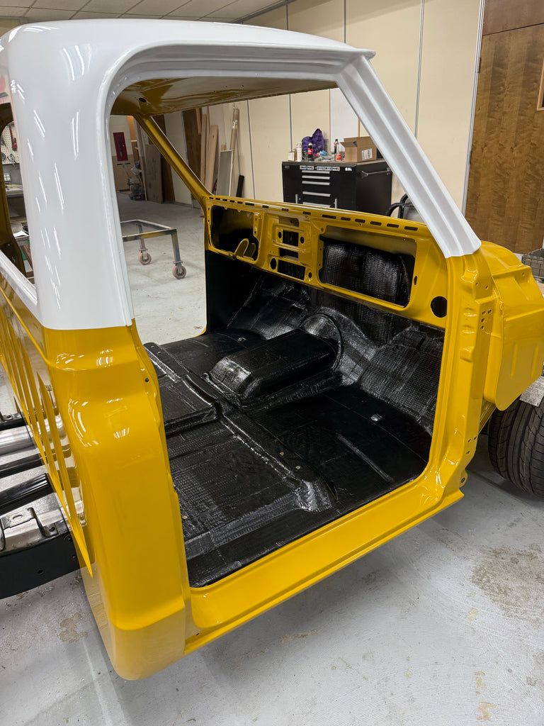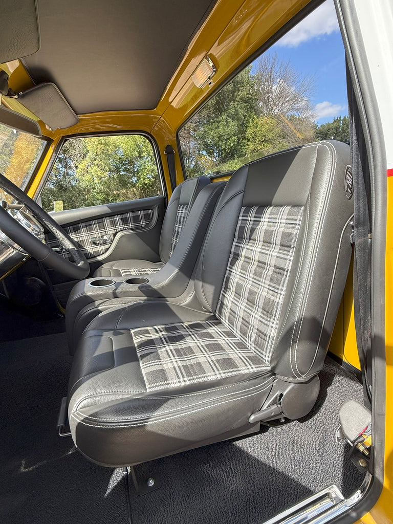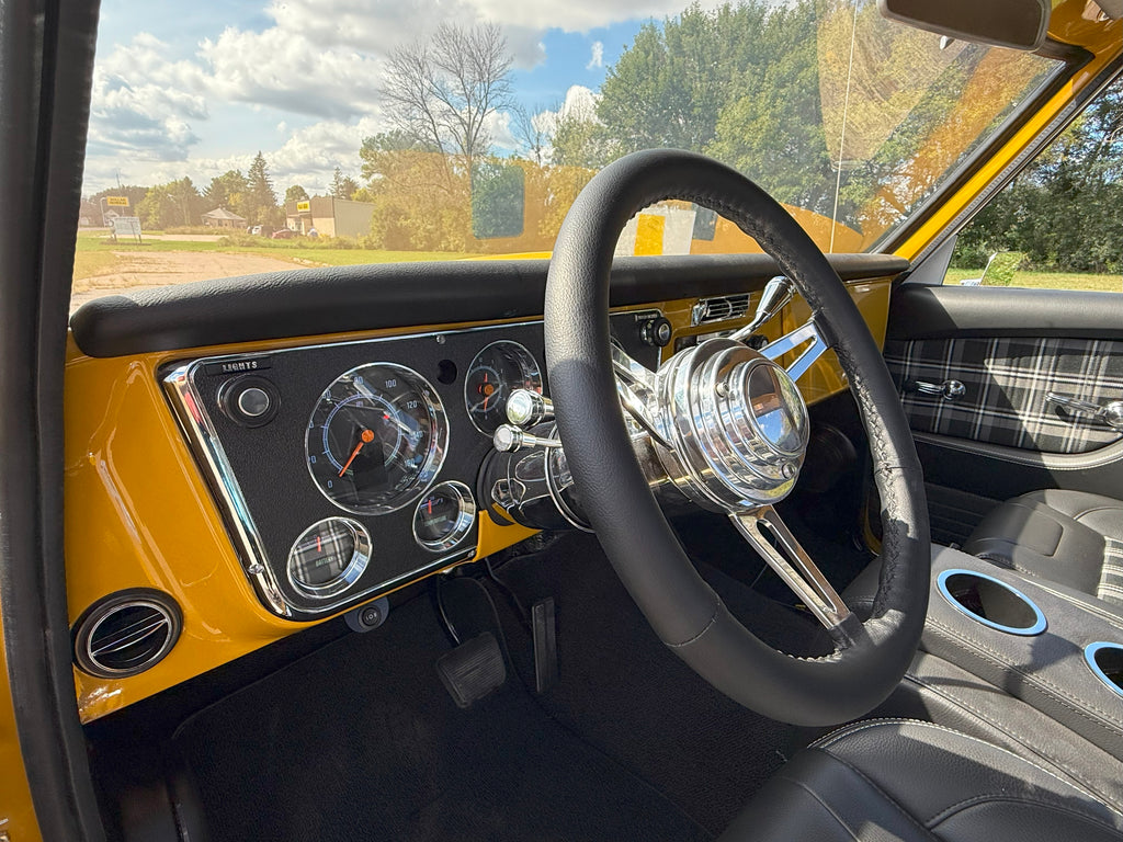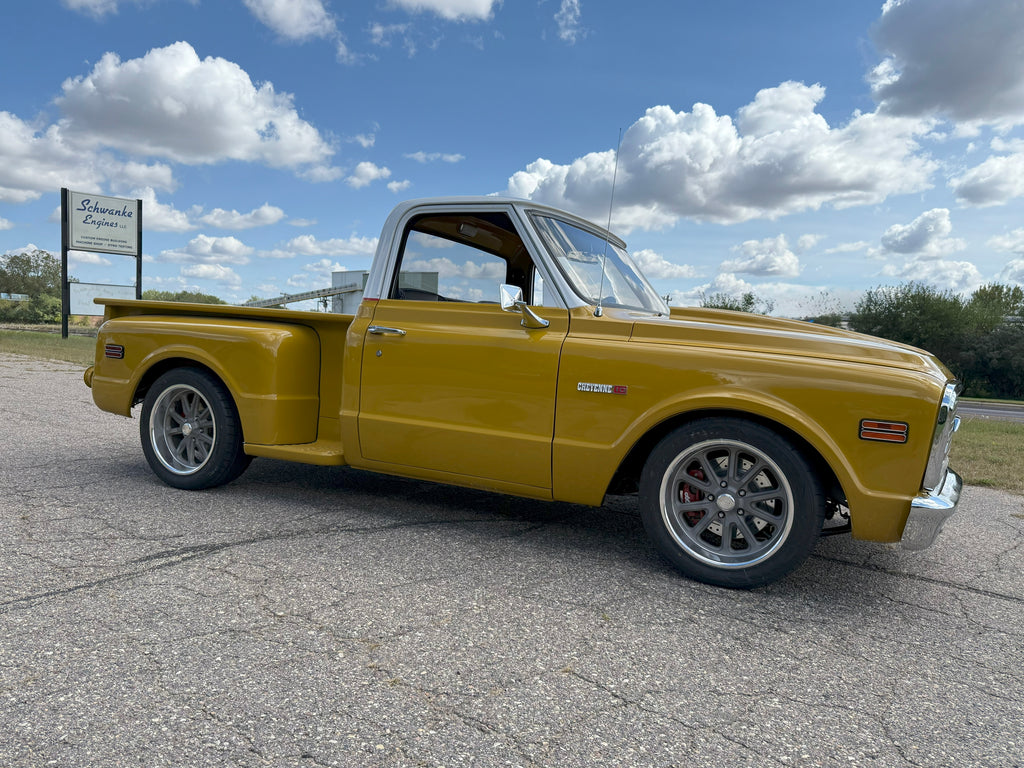 The truck is built with all new cab, box, and body metal, finished in a clean atlas yellow and pearl white two-tone. Subtle details like the stance, wheels, and overall fitment highlight the restomod nature without losing the original C10 character.