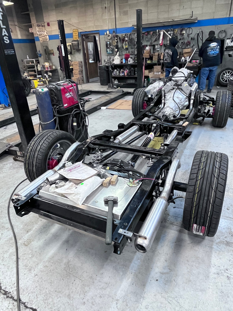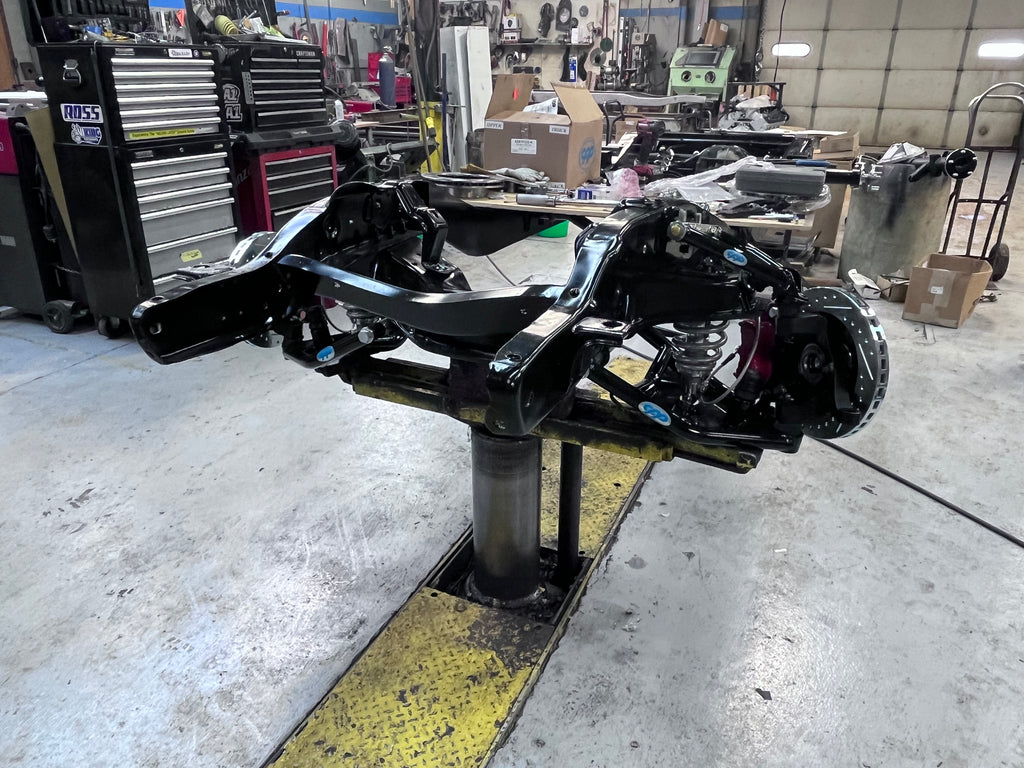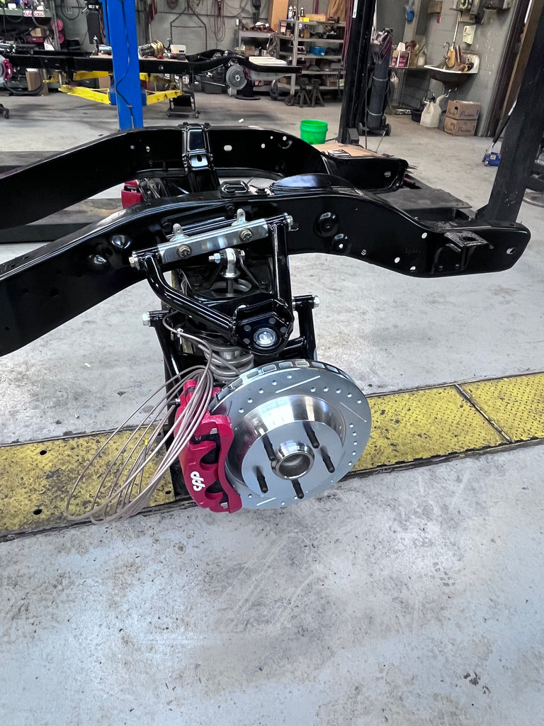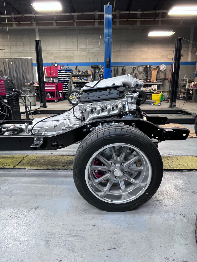 The suspension is equipped with dual-adjustable coilovers front and rear, tubular front control arms with drop spindles, and a rear tubular truck arm setup tied into a Ford 9-inch posi rear end with 3.50 gears. Together, the chassis and drivetrain provide a controlled ride and confident handling.